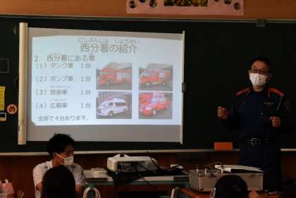 消防署の働きについて、西分署の署員さんを講師に招き、社会科の授業を行いました。