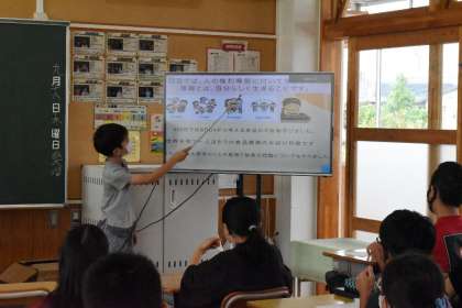 SDGsについては、特にフードロスについて取り上げ、夢農人とよた、ちゃぽっと、セブンイレブンの取組について説明していました。給食や買い物のときにできることもあり、自分たちができることを広めるだけでなく、お家の人にも伝えてほしいということでした。