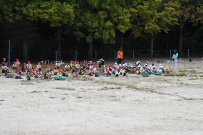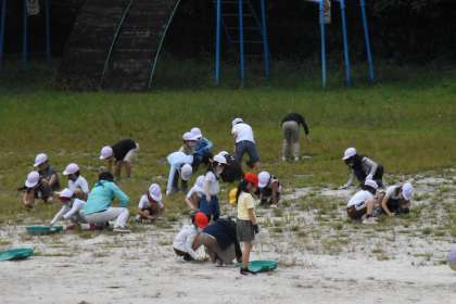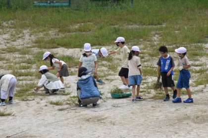 たくさん生えた草を学年ごとに時間を設定して、草取りに取り組みます。