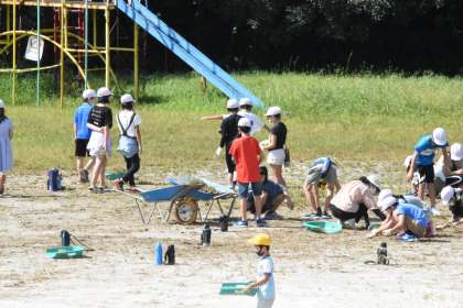 運動場の草取り