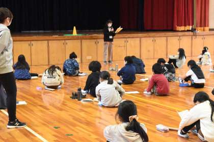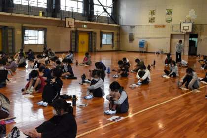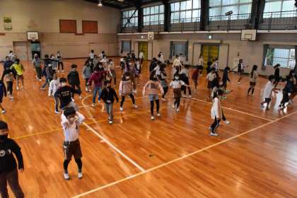 5年生がキャンプに向けて、キャンプファイヤーの練習をしていました。
