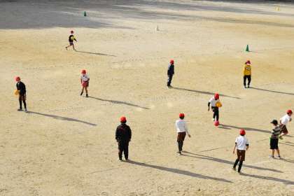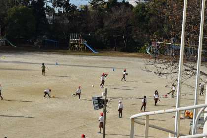 朝から寒い中、運動場でキックベースの学習です。