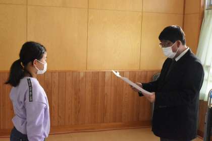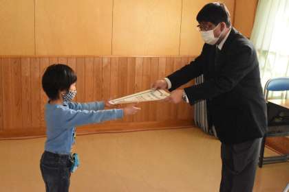 表彰伝達を行いました。地域の珠算教室に通う子たちががんばってくれました。