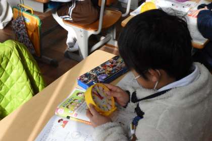 短い針が○と◎の間にあるから・・・というように、読み取りの練習です。