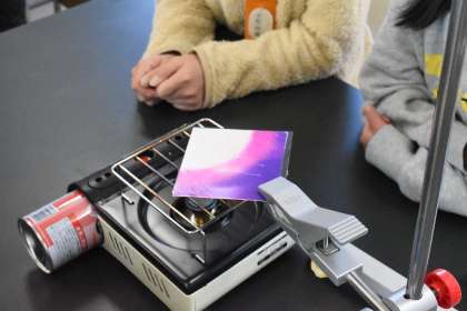 熱によって色の変わるシートを鉄板に貼って実験です。