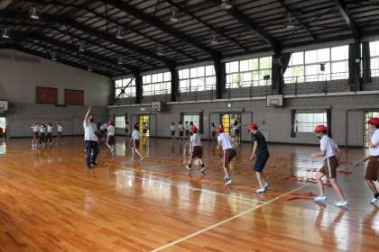 急遽、体育を運動場から体育館に変更して行いました。