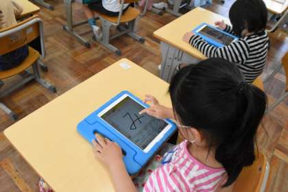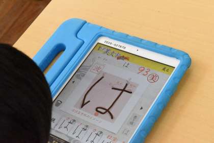 学習用タブレットで、美文字アプリを使ってひらがなの練習です。