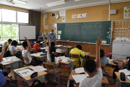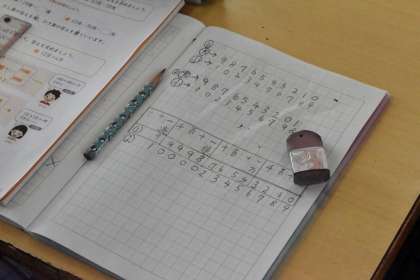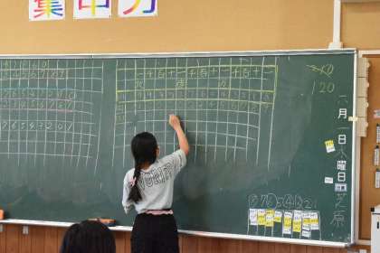 桁数が大きな数について、黒板にマス目を書いて、わかりやすくしています。