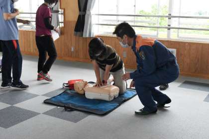 説明を聞いたあと、胸骨圧迫、AEDの使い方の実習を行いました。