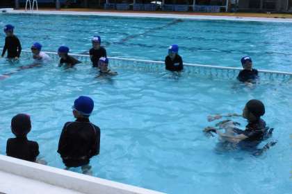 はじめはおっかなびっくりプールに入る子がいました。