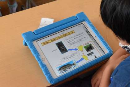 学習用タブレットを活用して、資料を読んだり、ビオトープに調査にでかけたりしていました。