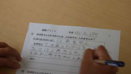 ワークシートに自分の考えを書いて、発表、どっちが大切か真剣に考えました。