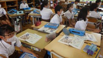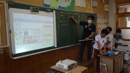 広告の工夫について、学習用タブレットを用いて発表していました。