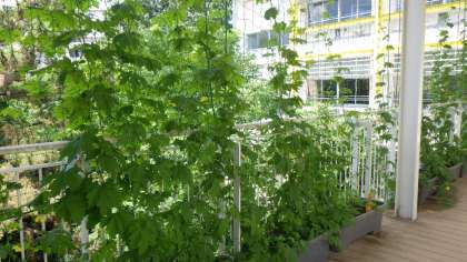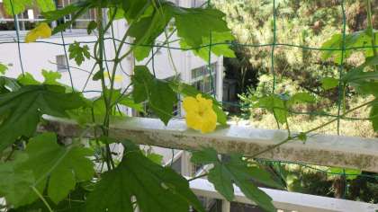4年生が育てているグリーンカーテンがずいぶん大きくなりました。