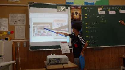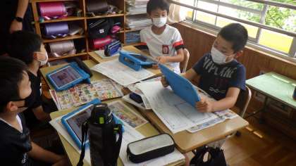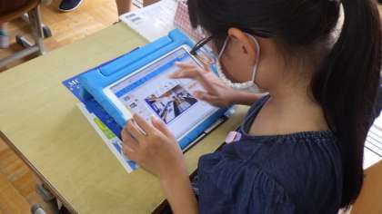学習用タブレットを活用して、考えを交流しながら学習を進めています。