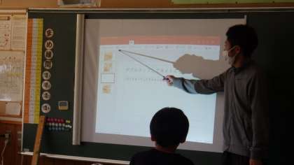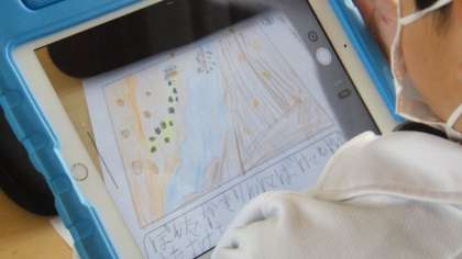 お話を考える学習です。第3場面を各自で考えて、絵にしました。その絵を学習用タブレットに取り込みます。