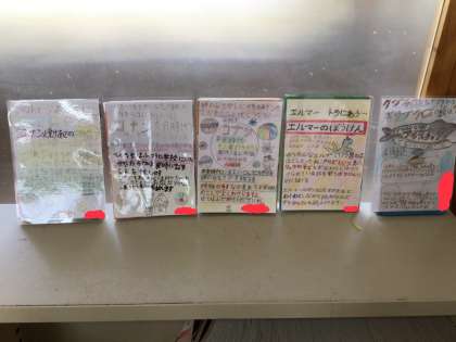 国語科の授業で、自分の好きな本の紹介をしました。紹介する本のpopを作り、教室を図書館のようにしました。