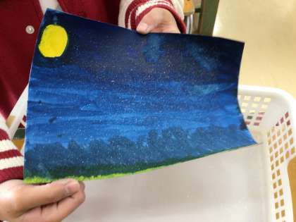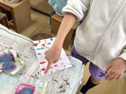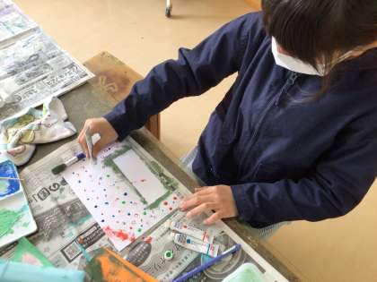 今日は前回作った作品を切って貼り付けたり、色を重ねたりして試行錯誤しています。色とりどりの模様になってきましたね。