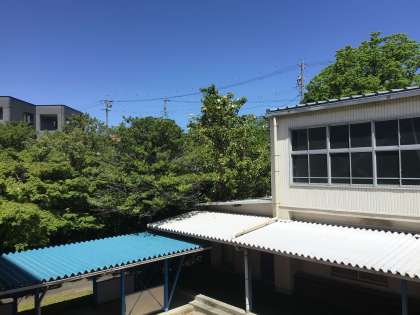体育館横の泰山木(タイサンボク)が白い花をつけました。背丈がかなり高くならないと咲かないそうです。上向きに咲く花なので、下からは見えません。