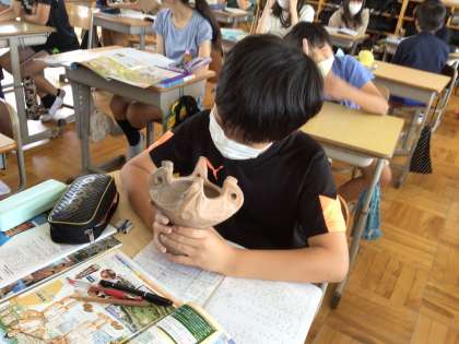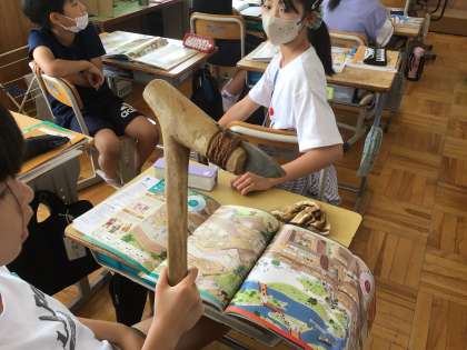 6年生が縄文時代と弥生時代を道具の模型を使って勉強していました。