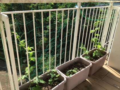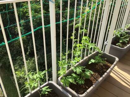 必死にツルレイシも巻き付いて、なんだかかわいいです♪