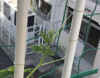 4年生が欠かさず世話をしているツルレイシが、空へと伸びていきます。