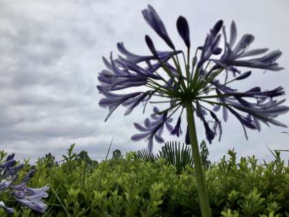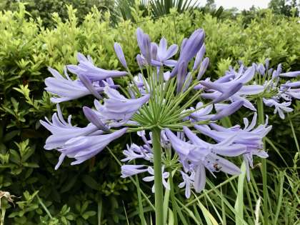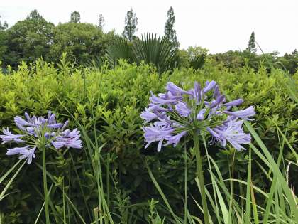 紫色のアガパンサスが、運動場と保健室の間の辺りで咲いています。