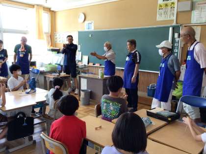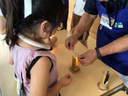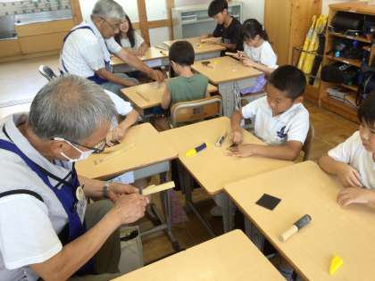 ものづくり教室の先生方に竹とんぼの作り方を教えていただきました。カッターで削って、熱で曲げます。今日は暑くて外で飛ばせませんでしたが、ものづくりの先生が運動場で飛ばす見本を見せると、校舎の屋上まで高く上がって歓声が上がりました。