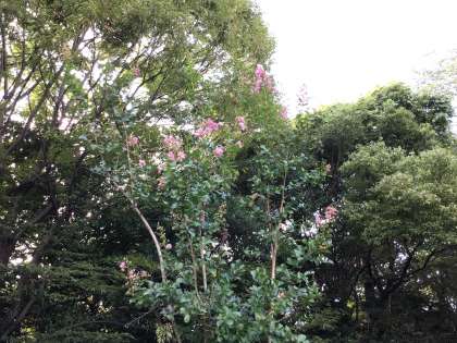 木登りの名人、お猿さんでも滑ってしまいそうなツルツルの樹皮をしているので、この名前がついたようです。運動場のバスケットゴール辺りにピンクとホワイトの百日紅が咲いています。