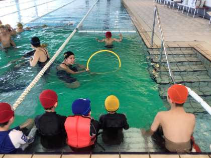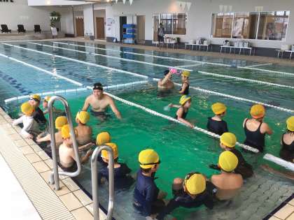 みんなで手をつないでジャンプしたり、水をかけ合ったりして少しずつ水に慣れていきました。