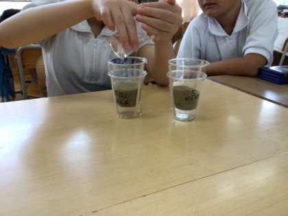 今日は雨水が土にしみこむのかどうかについて予想を立てて実験しました。
