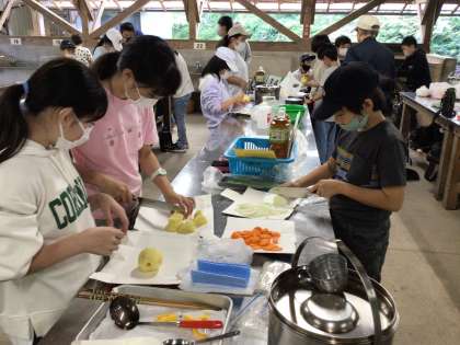 材料を切ったり、米を研いで飯盒で水を計ったり、とグループの協力もばっちりです。