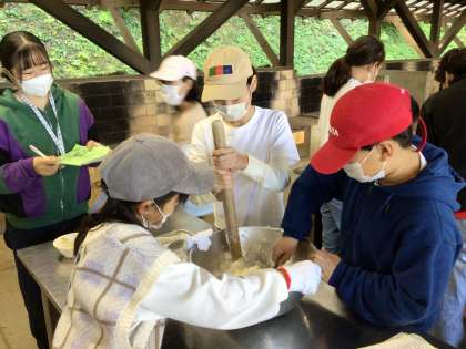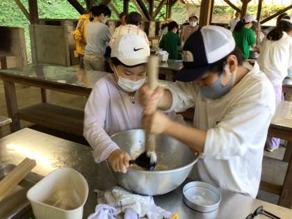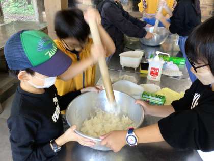 ボールを押さえる人と米をこねる人、どちらも力が入ります。 うまく形にできるかな。