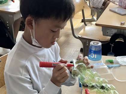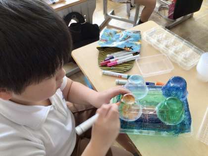 何をつくっているのかな? あっ、ワンちゃんがいるね。