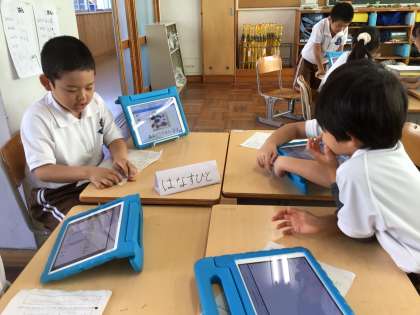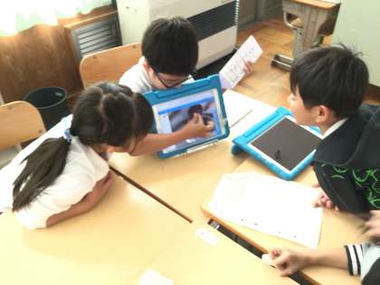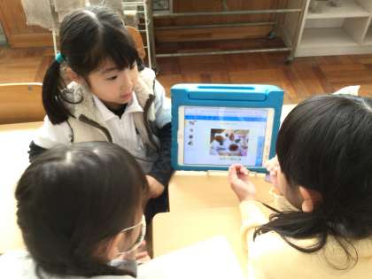 生活科で見つけた落ち葉や木の実で形を作って、タブレット撮影したものを見せながら、グループで楽しく話し合いをします。