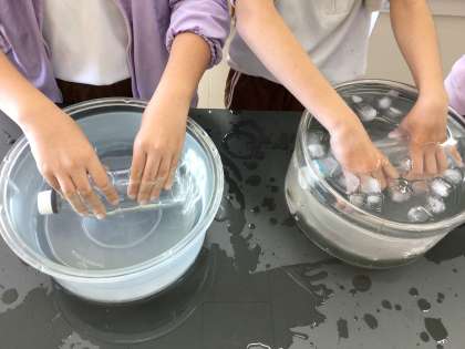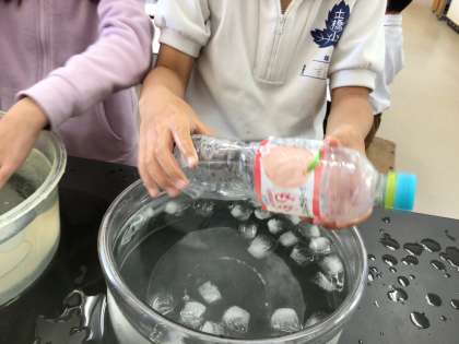 今日は、閉じ込めた空気を温めたり冷やしたりしたらどうなるか実験しました。