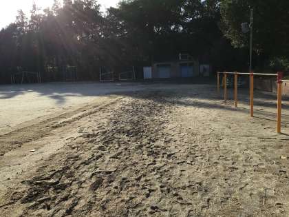 新しくなった鉄棒付近の砂が、雨が降ると粘土質の特性が出て、がたがたになることがわかりました。