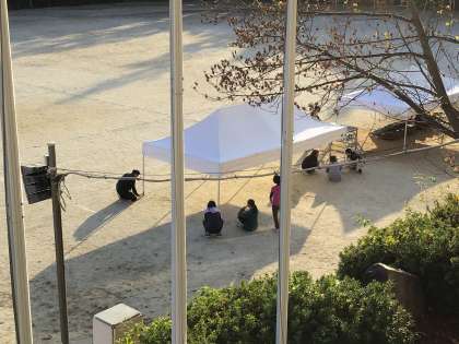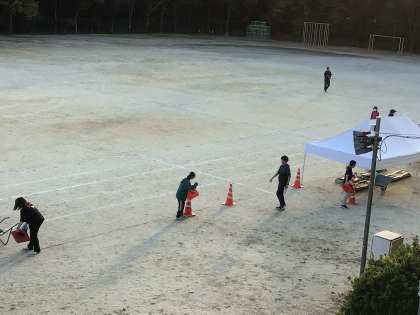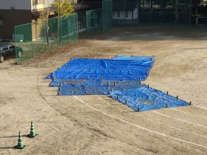 運動場のぬかるみがひどくなりそうなコーナーにブルーシートもひきました。