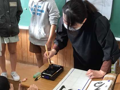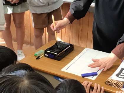 お手本に基準となる線を入れ、筆もしっかり根元まで下ろして墨汁を含ませるなど、いい字を書くために大切な準備から教えていただきました。