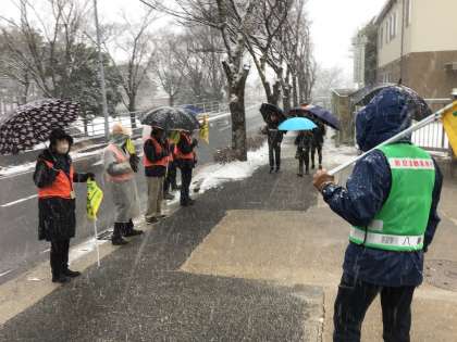 地域の見守りの皆さんがこんな雪の日も付き添ってくださっています。