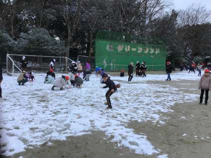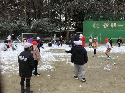 運動場に残っている雪で雪だるまを作ったり、雪合戦をしたり、と寒さそっちのけで大はしゃぎです。