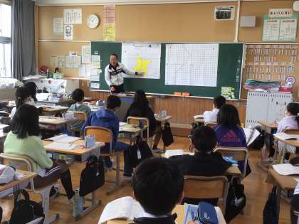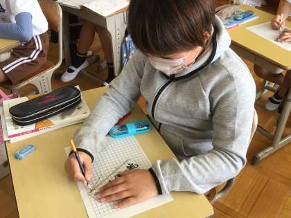 6年2組 算数 点対称の作図をしていました。 定規を使って正確に描いています。