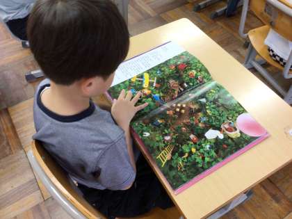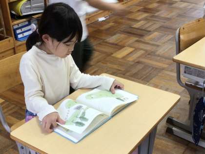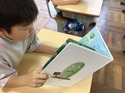 おおあめのなか とうこうしました。 おちついて ほんを よんで います。