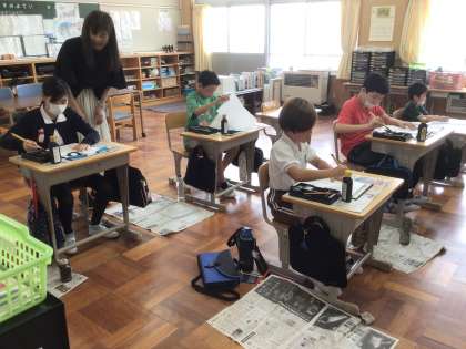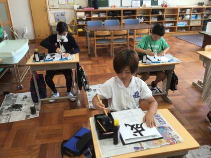 静かに、集中して書いていました。 筆使いは難しいですが、教頭先生と一緒に頑張りました。