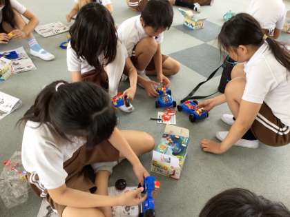 電池のはたらきで学んだことをいかして、乾電池を使った車を作りました。