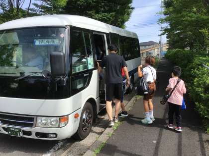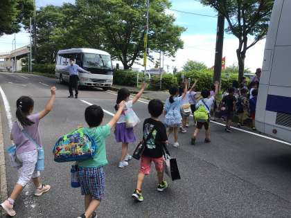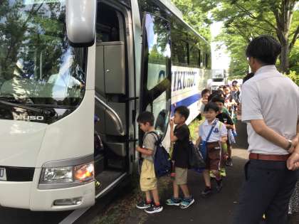 朝1年生と4、5組がバスで出発しました。