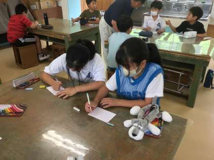 子どもたちの作品は福寿園の「福祉の心」絵手紙に応募します。(参加賞あり)