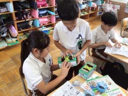 協力して「輪ゴムギター」や「鳴き声カップ」を作っていました。
