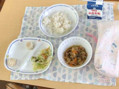 お待ちかねの給食です。 今日のメニューは豚丼です。 1年生の配膳も早く、上手になりました。