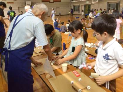 たくさんの講師の先生に教えていただきながら、ダンボールやペットボトルのキャップなどを使って車を作りました。ホットボンドやニッパーも使います。